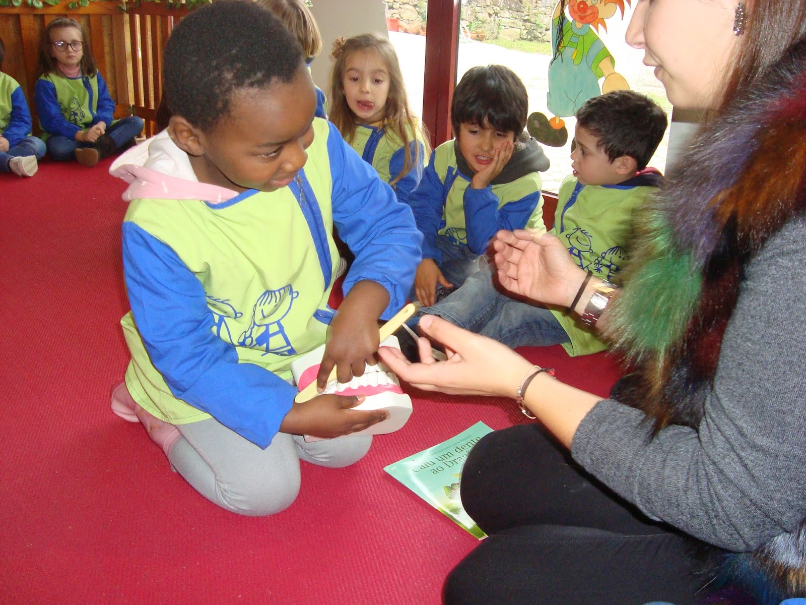 A mãe da Maria Valadares veio contar uma história "Caiu um dente ao dragão", depois ofereceu-nos escovas e pastas e fomos todos lavar os dentes. obrigada